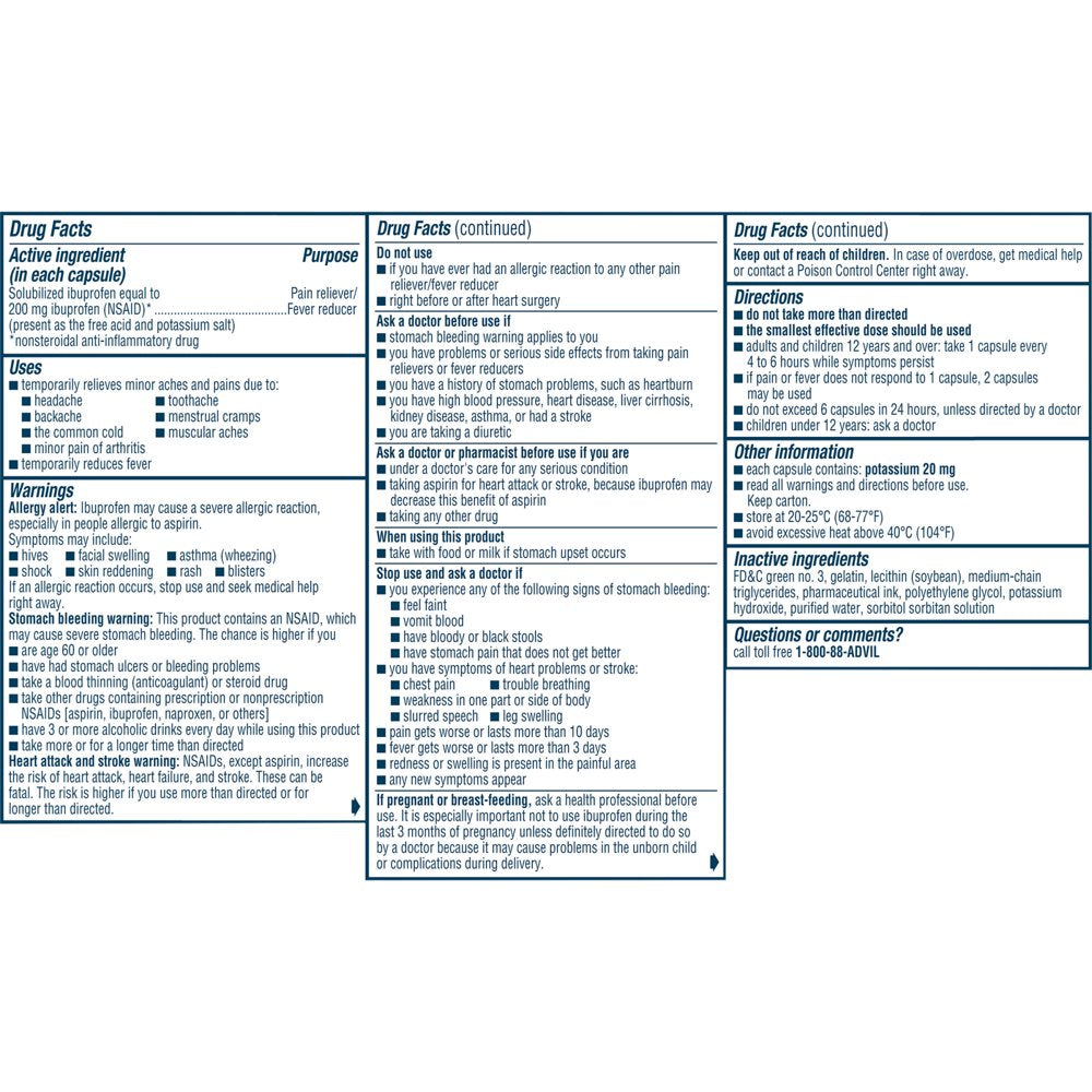 - One package of 80 Advil Liqui-Gels Pain Reliever and Fever Reducer liquid filled capsules, with ibuprofen 200mg for pain relief