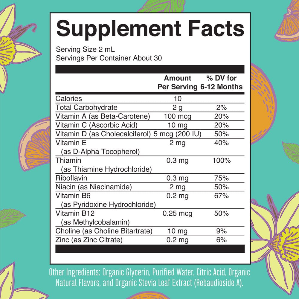- Organic Multivitamin Liquid Drops: Our first liquid multivitamin formulated just for babies! Support growth, brain development, and more with these liquid drops. Packed with some essential nutrients for your baby such as vitamins A, C, B, D, E, and Zinc, all in a delicious orange-vanilla flavor.