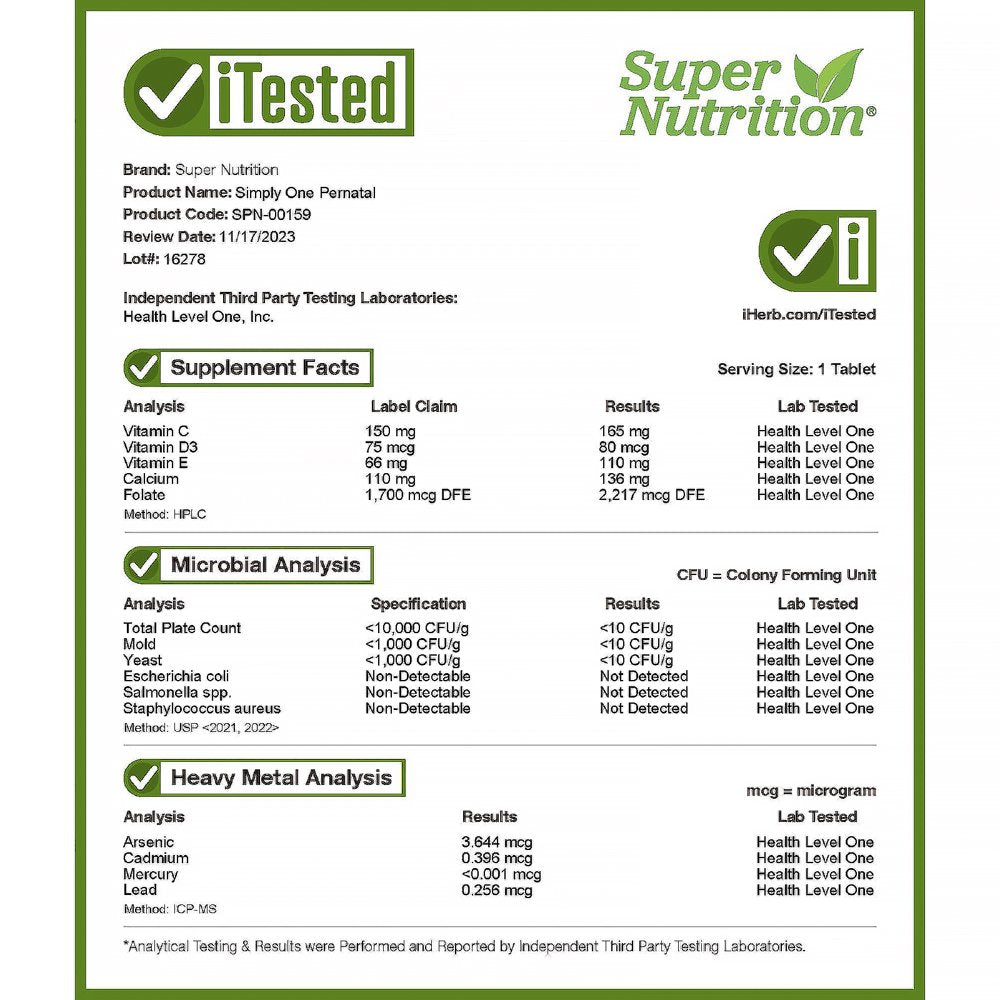 Super Nutrition® SimplyOne® Prenatal Triple Power Multivitamins contain a unique blend of vitamins, minerals, and botanicals to support your immune system and energy production during pregnancy.* Specifically Formulated for Expecting Mothers Support for Immune System and Energy Production* Formulated without Gluten or GMOs iTested Verified