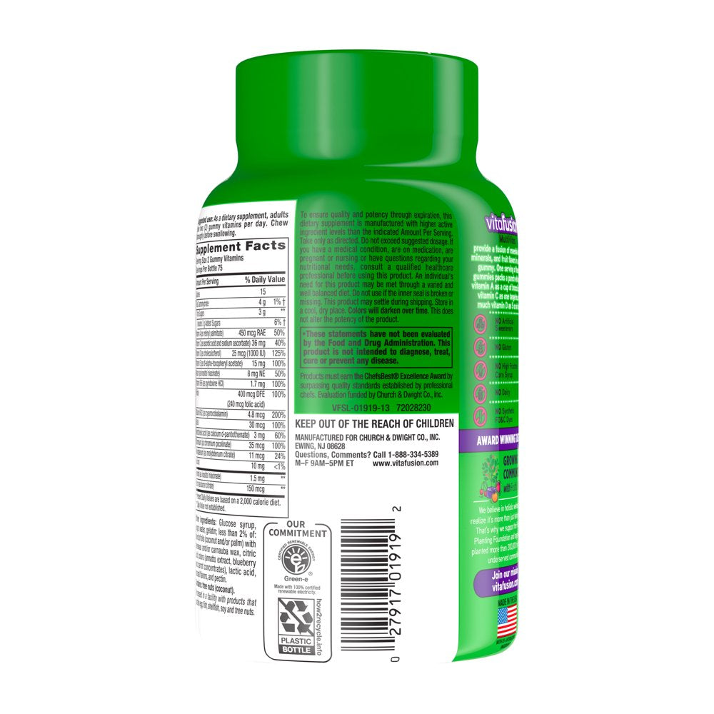 Vitafusion MultiVites Gummy Multivitamins for Adults are daily gummy vitamins that provide a fusion of essential vitamins, minerals and natural fruit flavors. This multivitamin is formulated for adults and provides a great-tasting and convenient alternative to traditional, hard-to-swallow vitamin pills. Vitafusion believes that taste and nutrition can be fused together, ensuring that taking your daily multivitamin is an easy and delicious part of your day. Each two-gummy serving of these daily multivitamins supports everyday health (1) by providing an excellent source of 12 vitamins. One serving of these dietary supplements contains as much Vitamin A as a cup of broccoli, as much Vitamin C as one tangerine, and as much Vitamin D as 5 ounces of salmon. Each flavorful and nutritious multivitamin gummy is made with no artificial flavors or sweeteners, no gluten, no high-fructose corn syrup, no dairy and no synthetic FD&C dyes. This 150-count bottle of vitamin gummies has enough for 75 days. Vitafusion is the only gummy vitamin brand with products that have been awarded the ChefsBest Excellence award for taste; vitafusion MultiVites Gummy Multivitamins were the recipient of the 2021 ChefsBest Excellence Award (2). Take a fruitful step toward a healthier, happier world with America’s #1 Gummy Vitamin Brand.(1) These statements have not been evaluated by the Food and Drug Administration. This product is not intended to diagnose, treat, cure or prevent any disease. (2) The ChefsBest Excellence Award is awarded to brands that surpass quality standards established by independent professional chefs. Evaluation funded by Church & Dwight Co., Inc.
